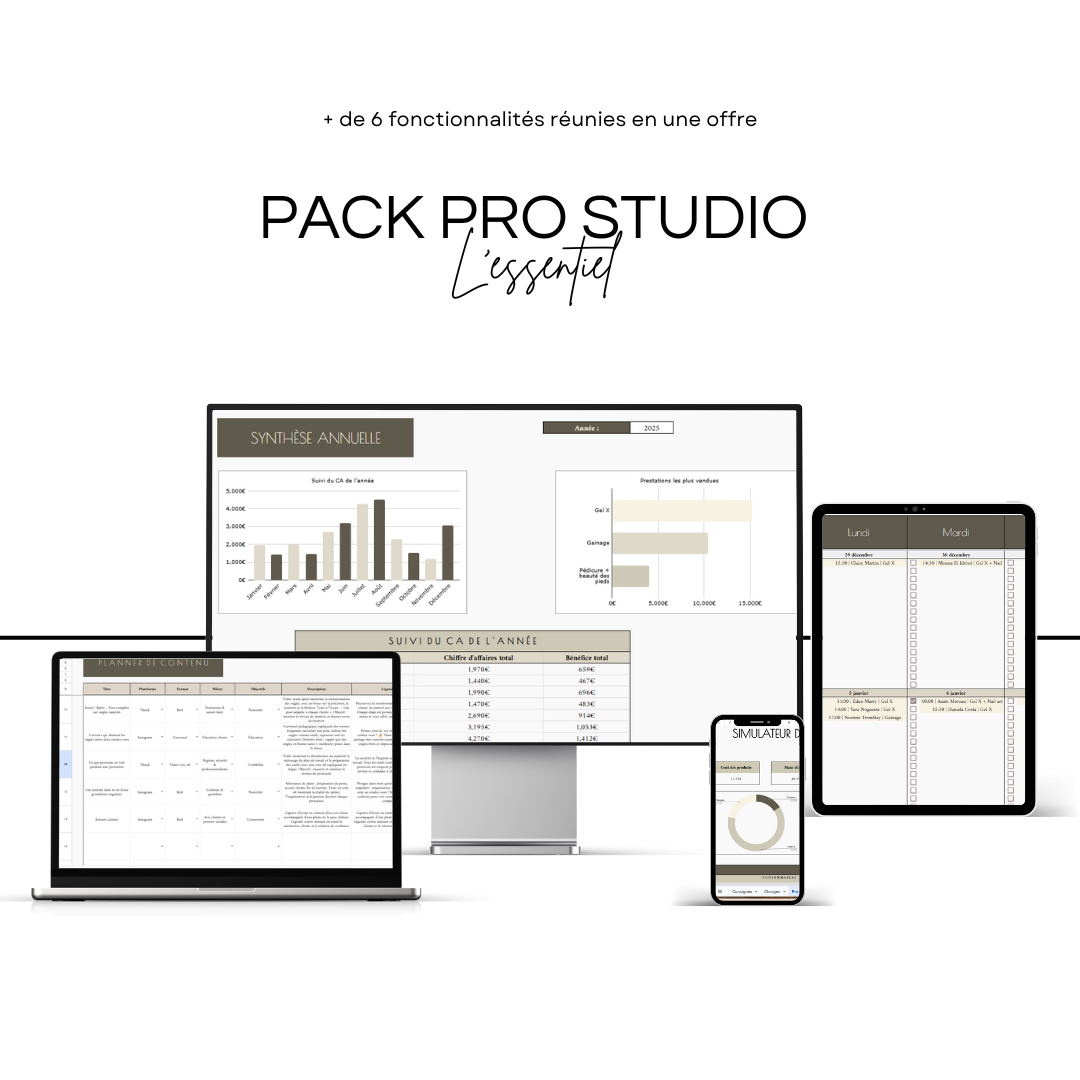 Planifie tes rendez-vous, tes prestations, ton contenu et tes chiffres avec simplicité. Moins de stress, plus de contrôle, plus de profit.